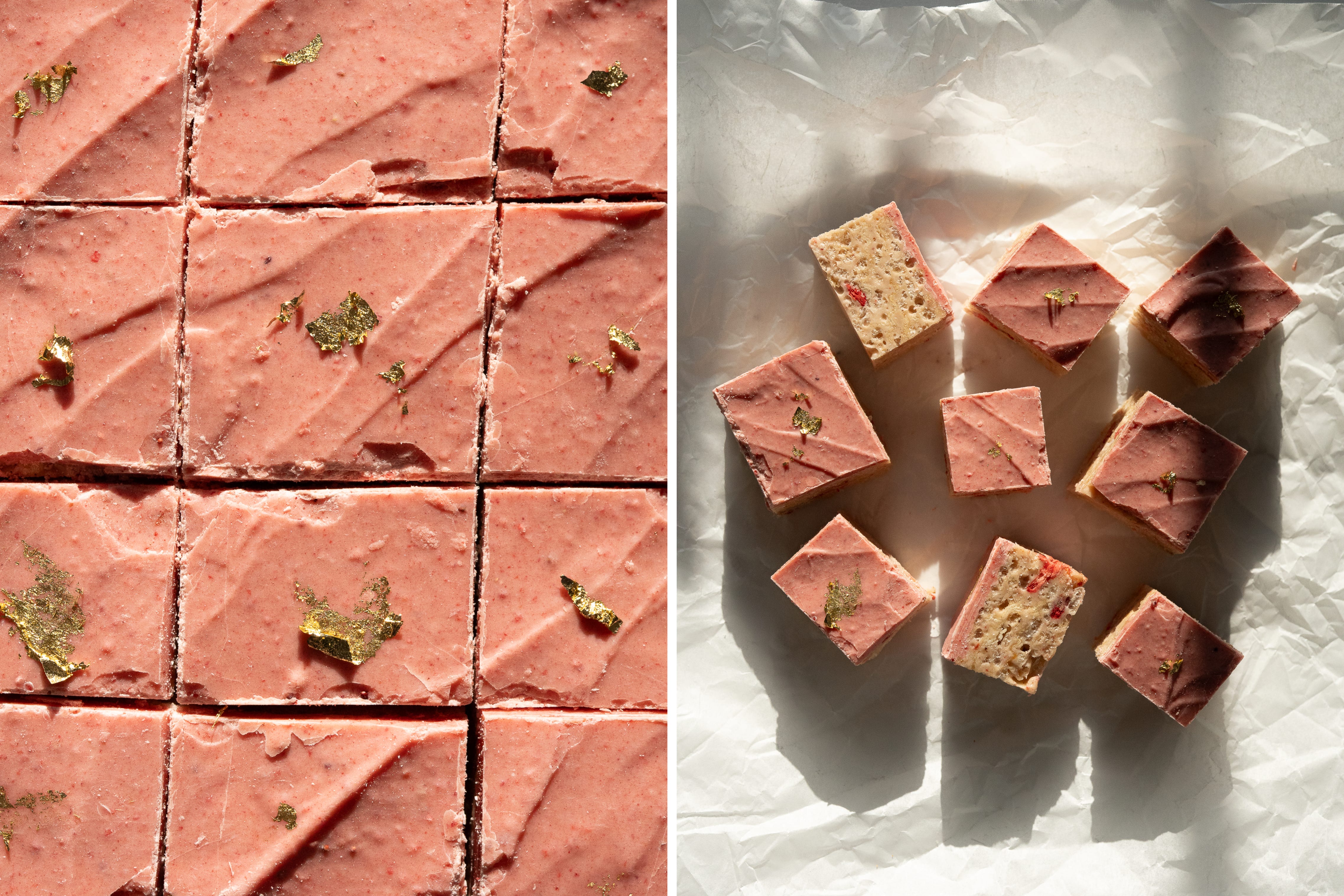 Here, the humble rice krispie treat gets a thoroughly grown-up reimagining. The base is a golden tangle of browned butter and marshmallow - rich, toasty, unapologetically chewy. Crisped rice and shards of salt and vinegar chips/crisps (yes, crisps!) are then added, their briny tang subtly cutting through the sweetness with a wink. Finally, freeze-dried strawberries are folded in, shattering into sherbet-like fragments that dissolve on the tongue with a tart, perfumed fizz.