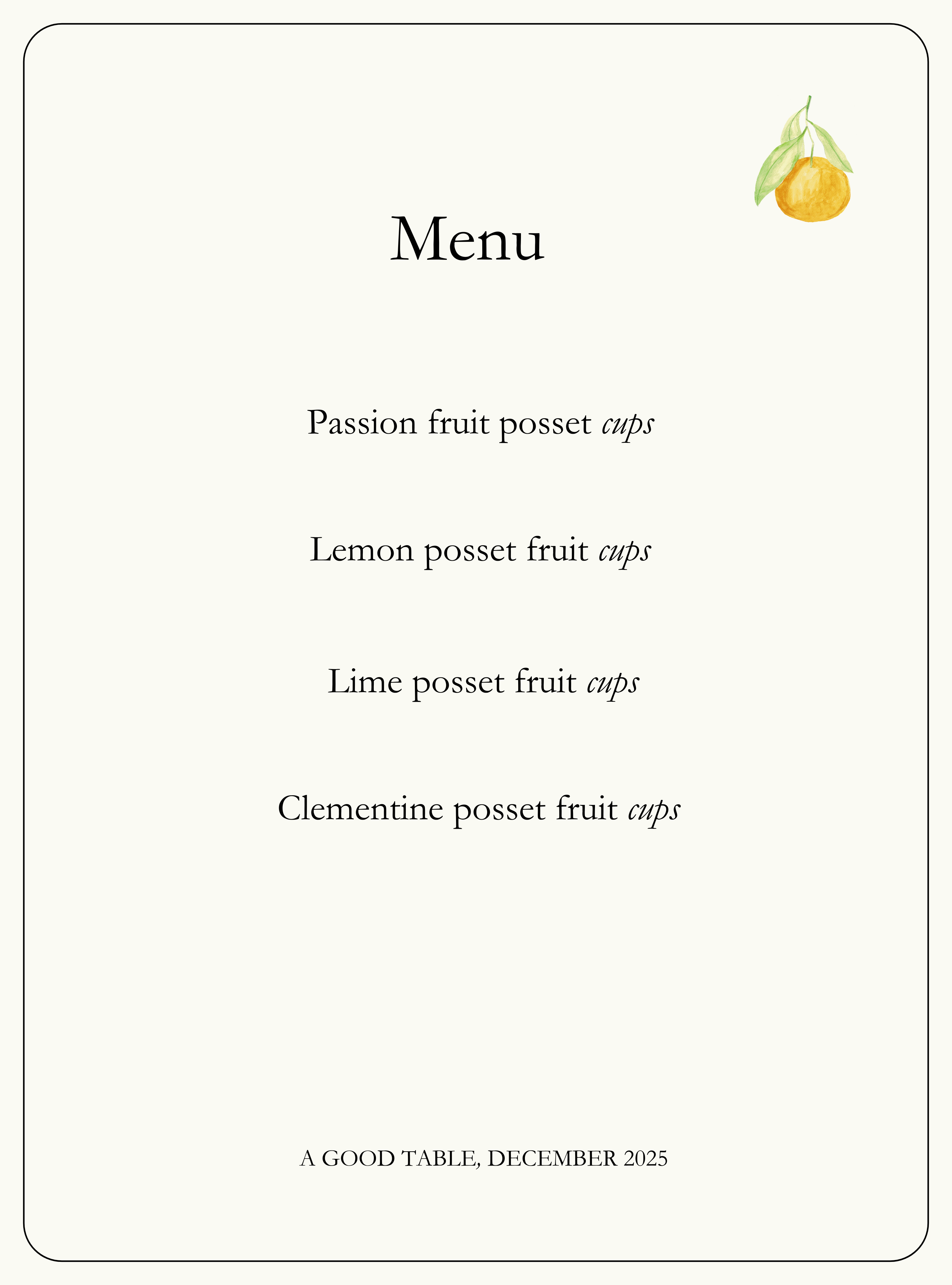 Now, when family and friends descend for the holidays, I have little appetite for oven-wrangling or balancing delicate, high-maintenance fiddly cakes. Instead, I return to a guiding principle learnt from my mother: when the ingredients are good, one need not interfere too much. Enter the fruit cup possets. Three ingredients, ten minutes, no oven, no stress! Hurrah. They rapidly set in the refrigerator whilst I bustle about the kitchen, performing usefulness with great conviction. And they vanish almost as soon as they are served — more swiftly than any fancy sky-high soufflé I have ever pleaded into rising.