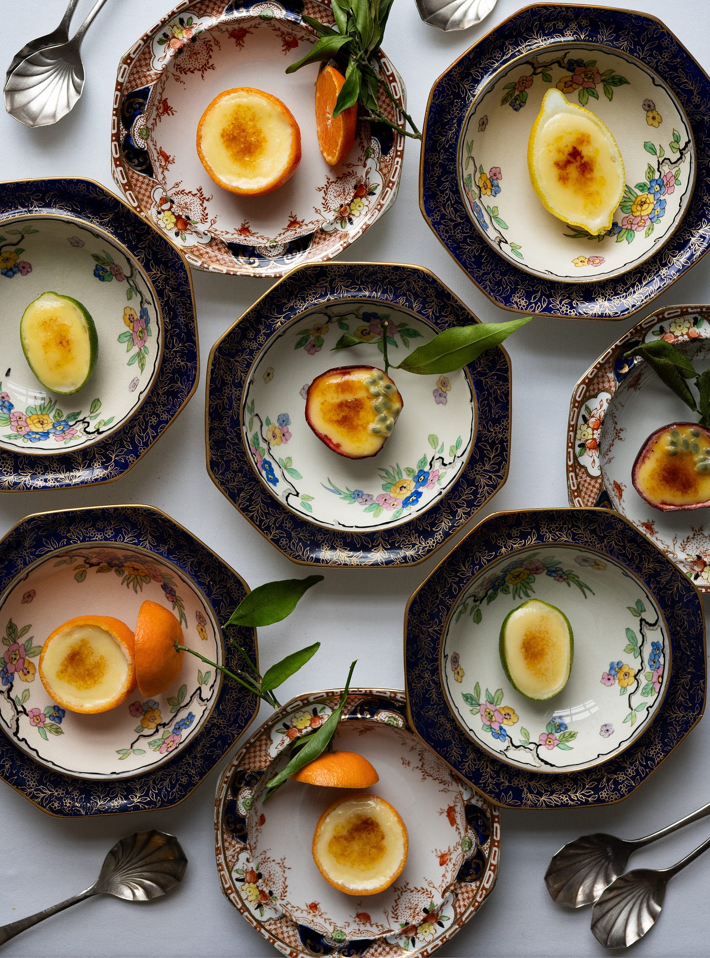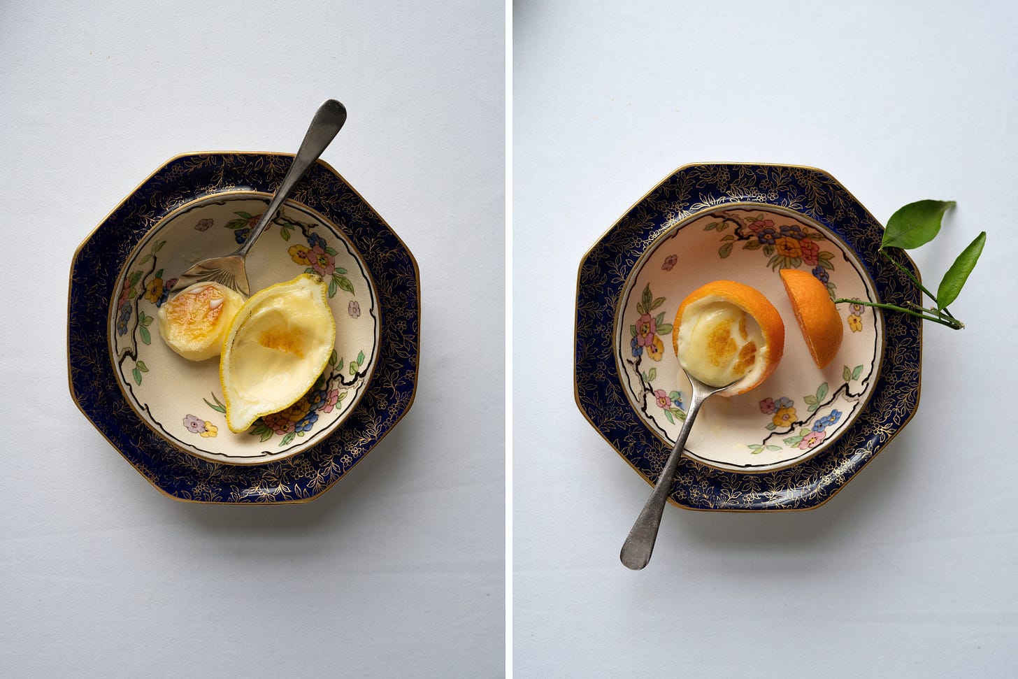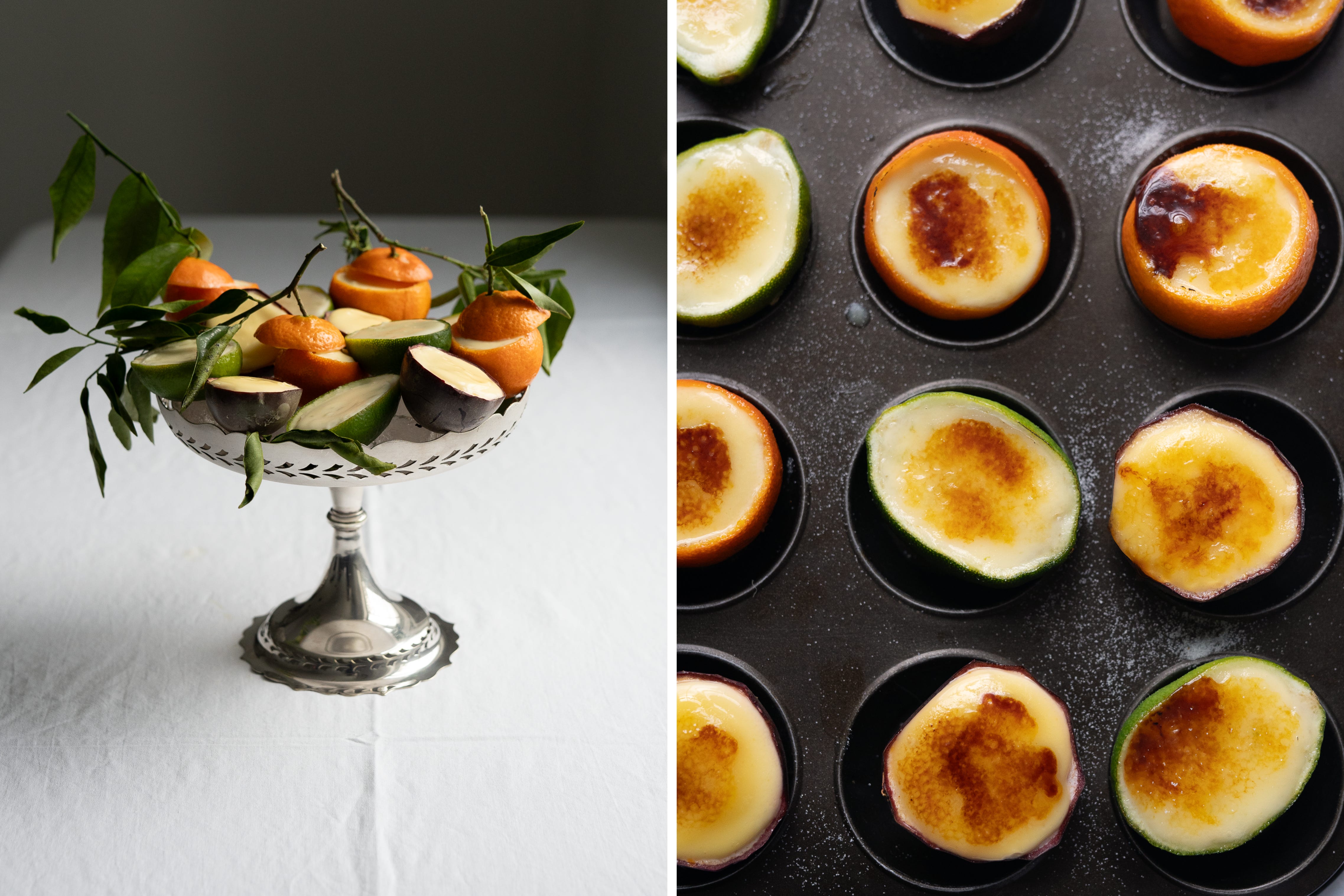 I prepare the fruit cups in advance, setting the hollowed shells in muffin tins before filling them with the posset. A few hours in the refrigerator is all that’s needed for them to set. If time allows, I finish them with a scattering of sugar. You may then take a blowtorch to the tops yourself. Or — better still — enlist a willing family member, or any obliging pyromaniac, to do the brûléeing while you gather yourself and take a restorative sip of something cold, or strong, or ideally both. The spectacle is brief, the applause immediate, and you are left looking far more industrious than you have any right to.
