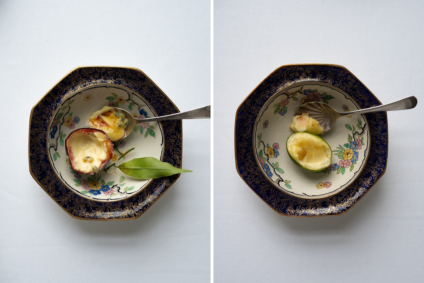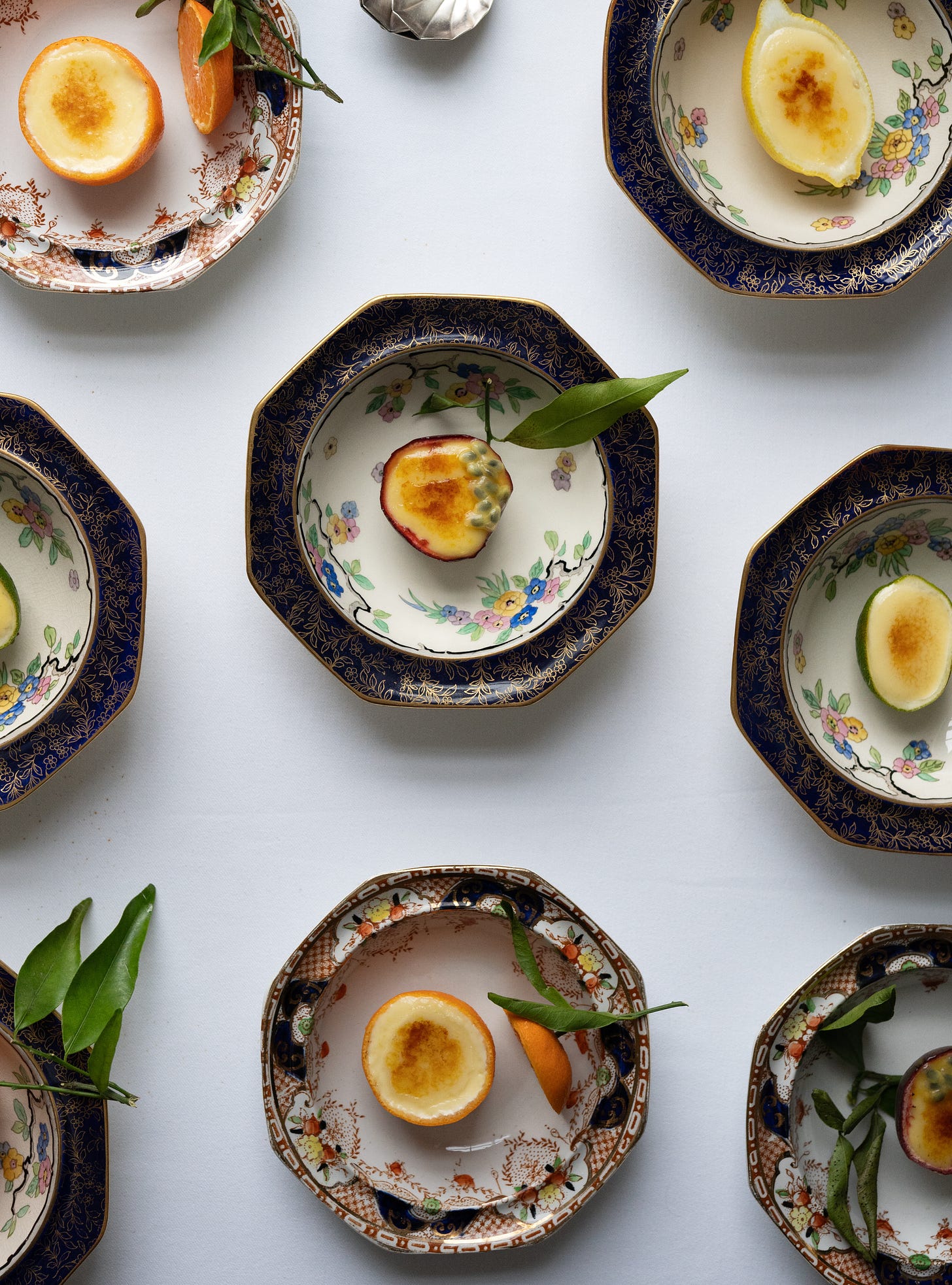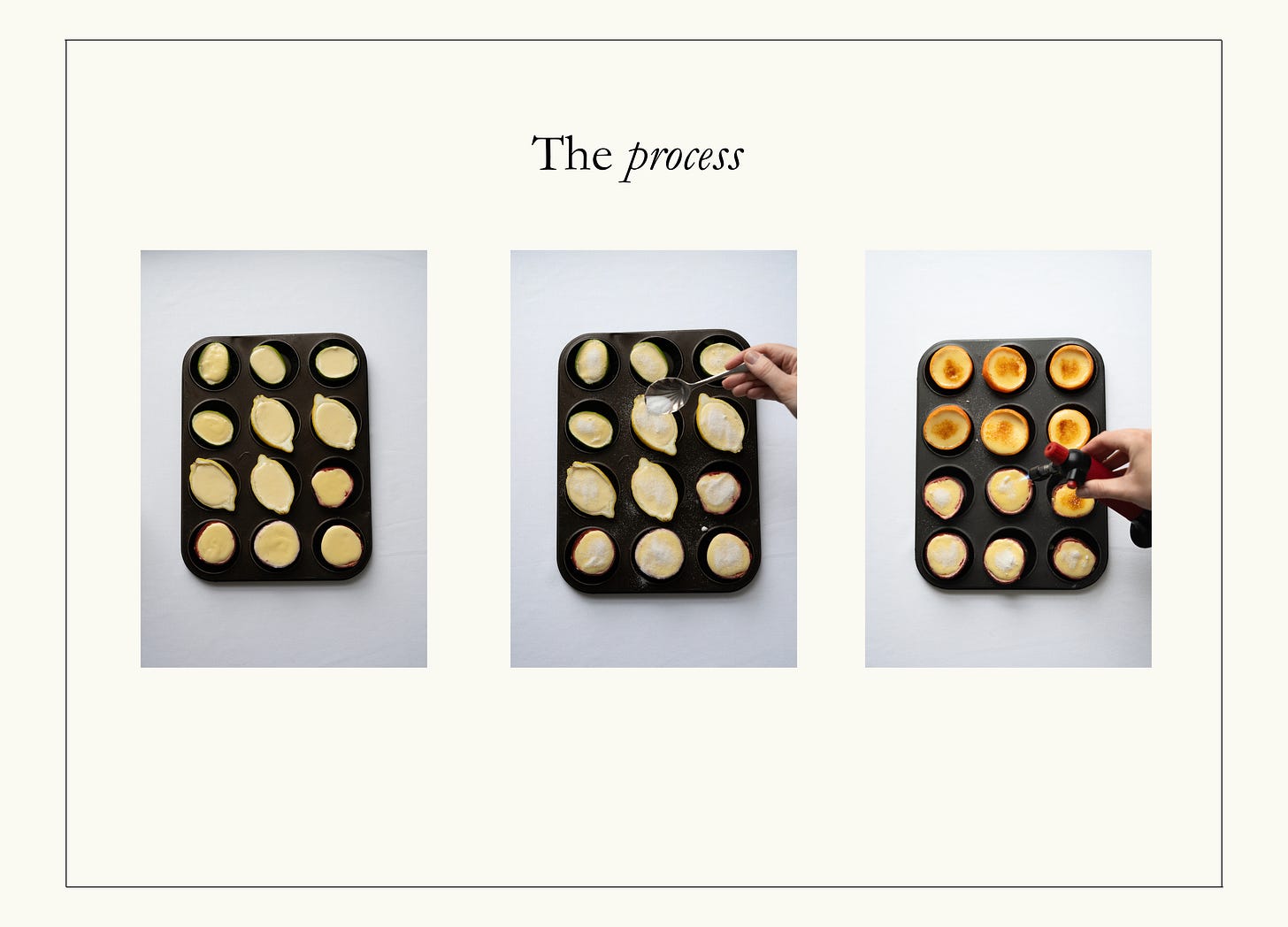 I prepare the fruit cups in advance, setting the hollowed shells in muffin tins before filling them with the posset. A few hours in the refrigerator is all that’s needed for them to set. If time allows, I finish them with a scattering of sugar. You may then take a blowtorch to the tops yourself. Or — better still — enlist a willing family member, or any obliging pyromaniac, to do the brûléeing while you gather yourself and take a restorative sip of something cold, or strong, or ideally both. The spectacle is brief, the applause immediate, and you are left looking far more industrious than you have any right to.
