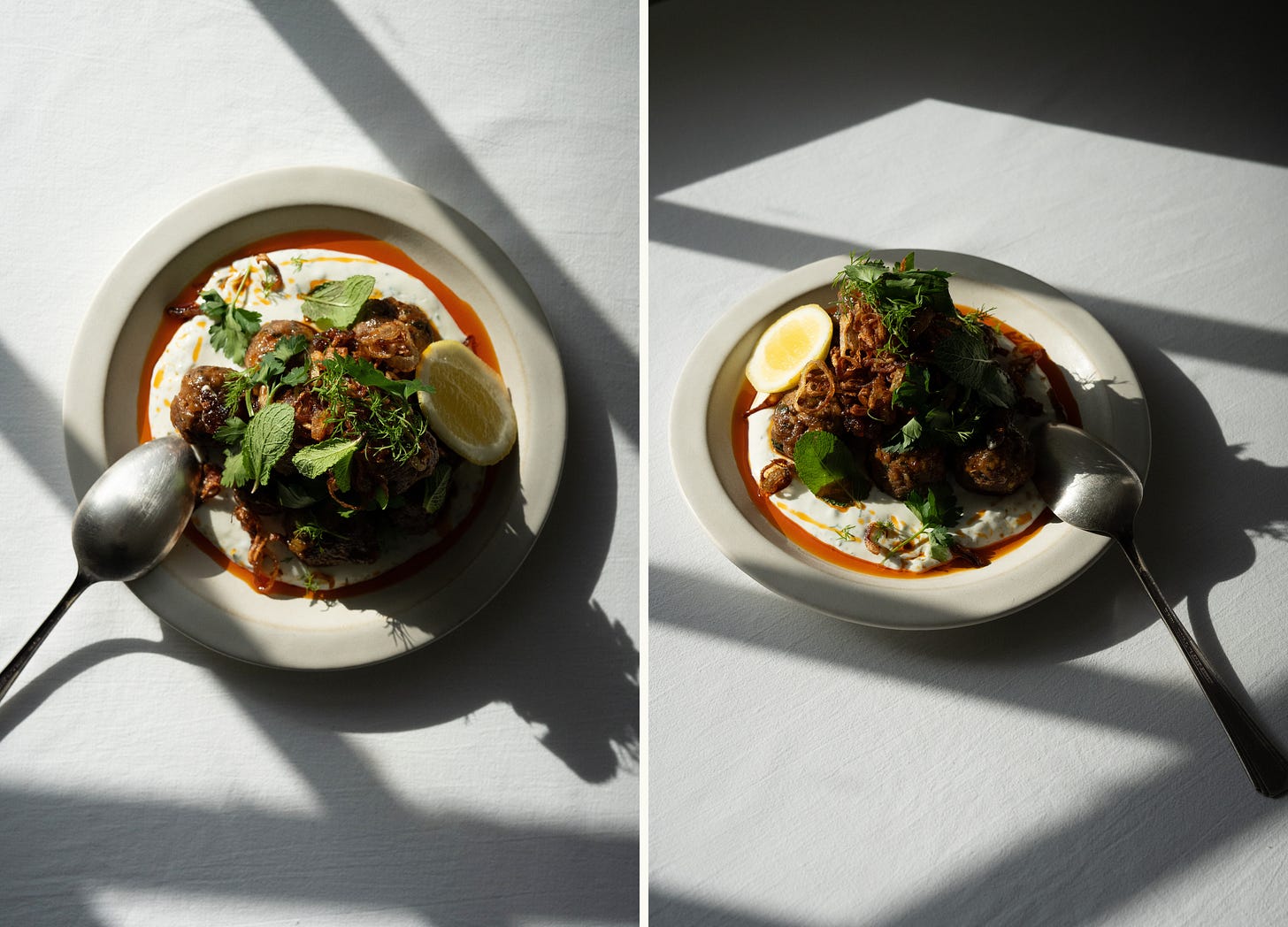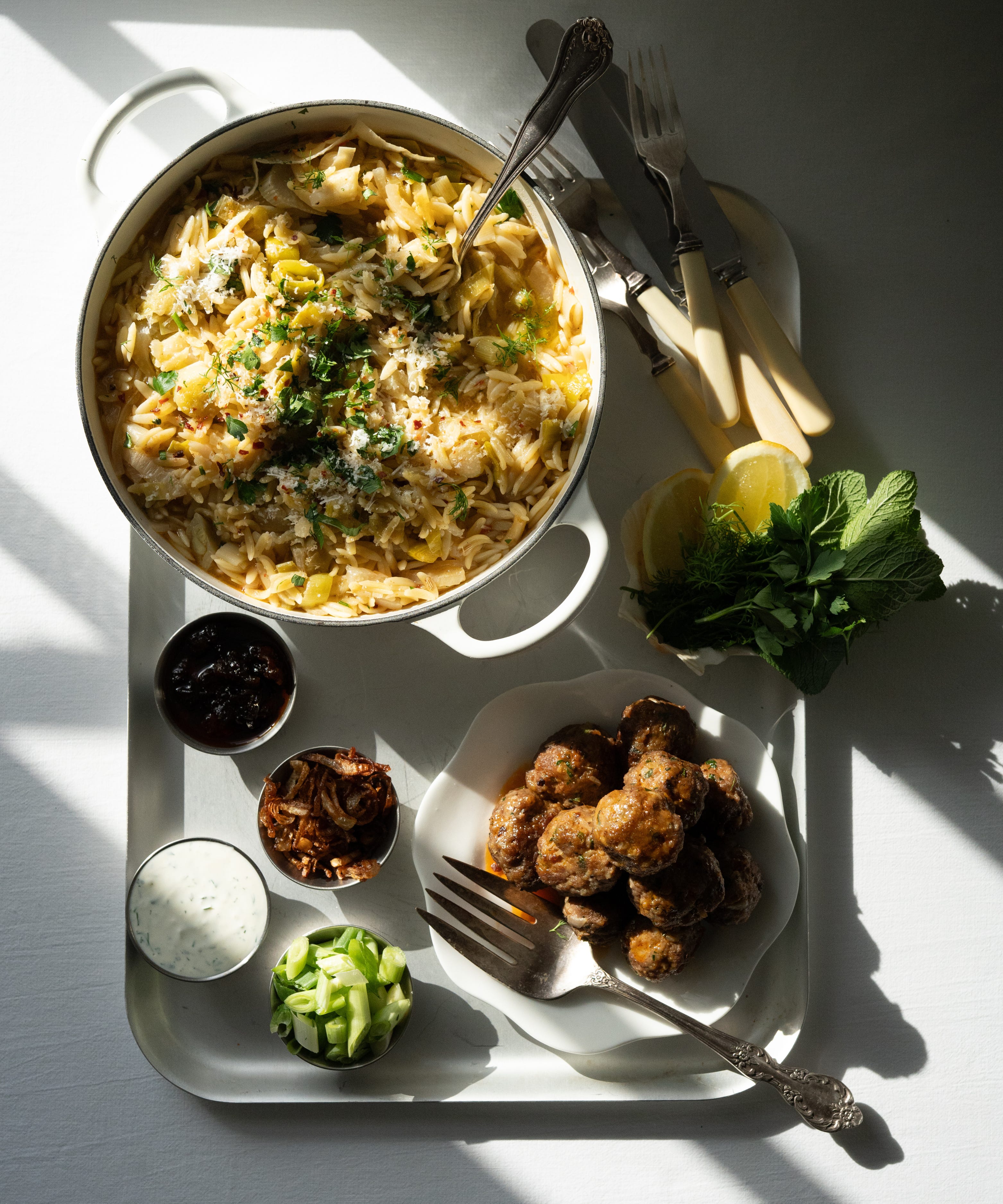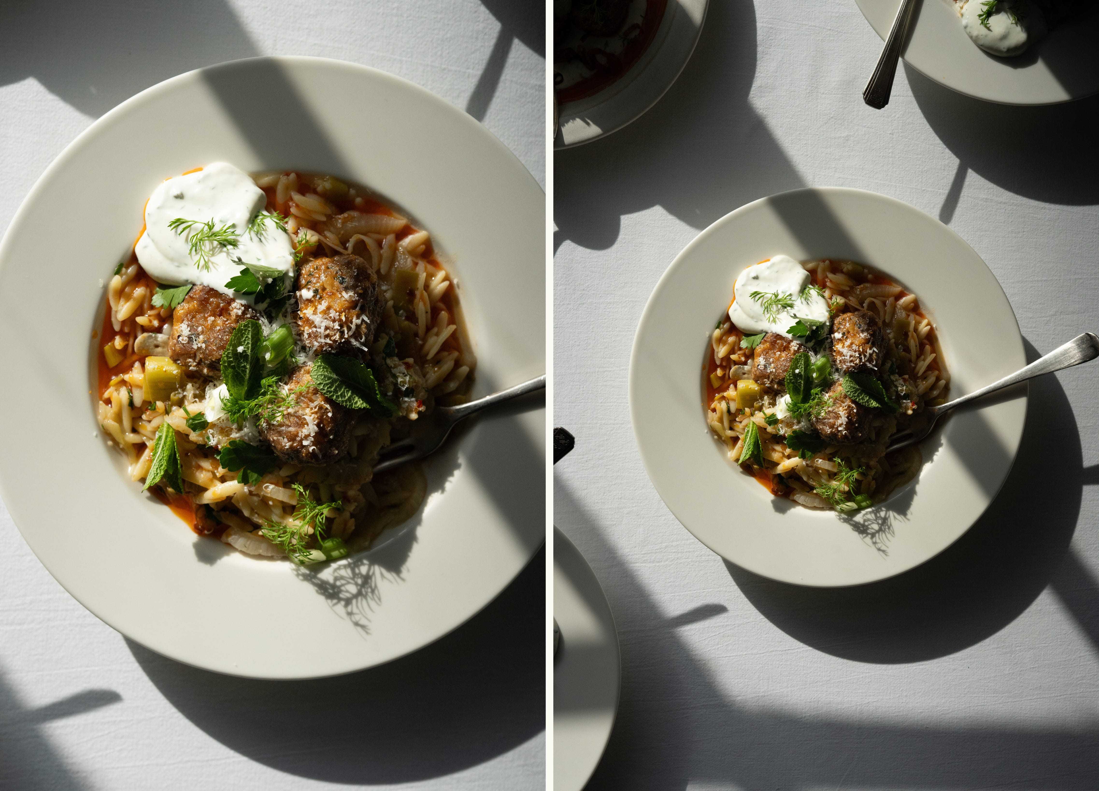 Serve however you like: Spoon the meatballs over the brothy orzo as intended, or serve the lamb on a generous bed of whipped ricotta with a drizzle of harissa and a scatter of shallots for something that feels closer to a restaurant-style starter.