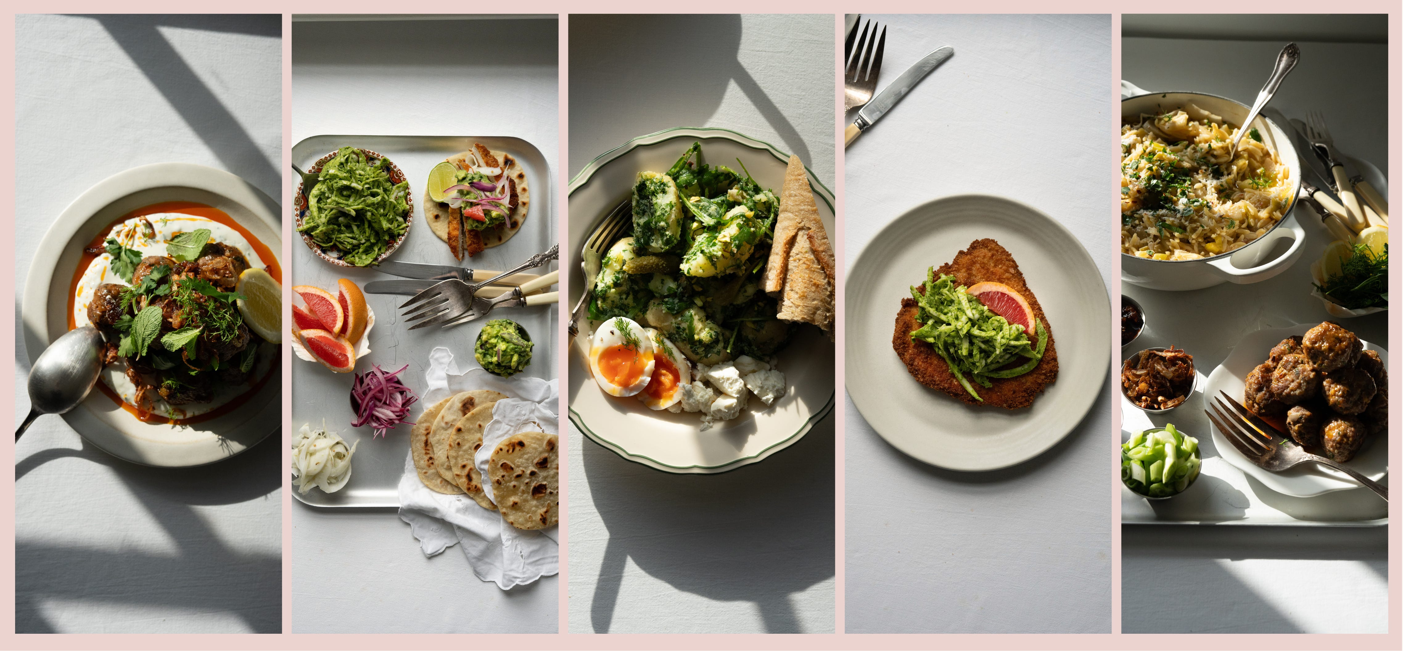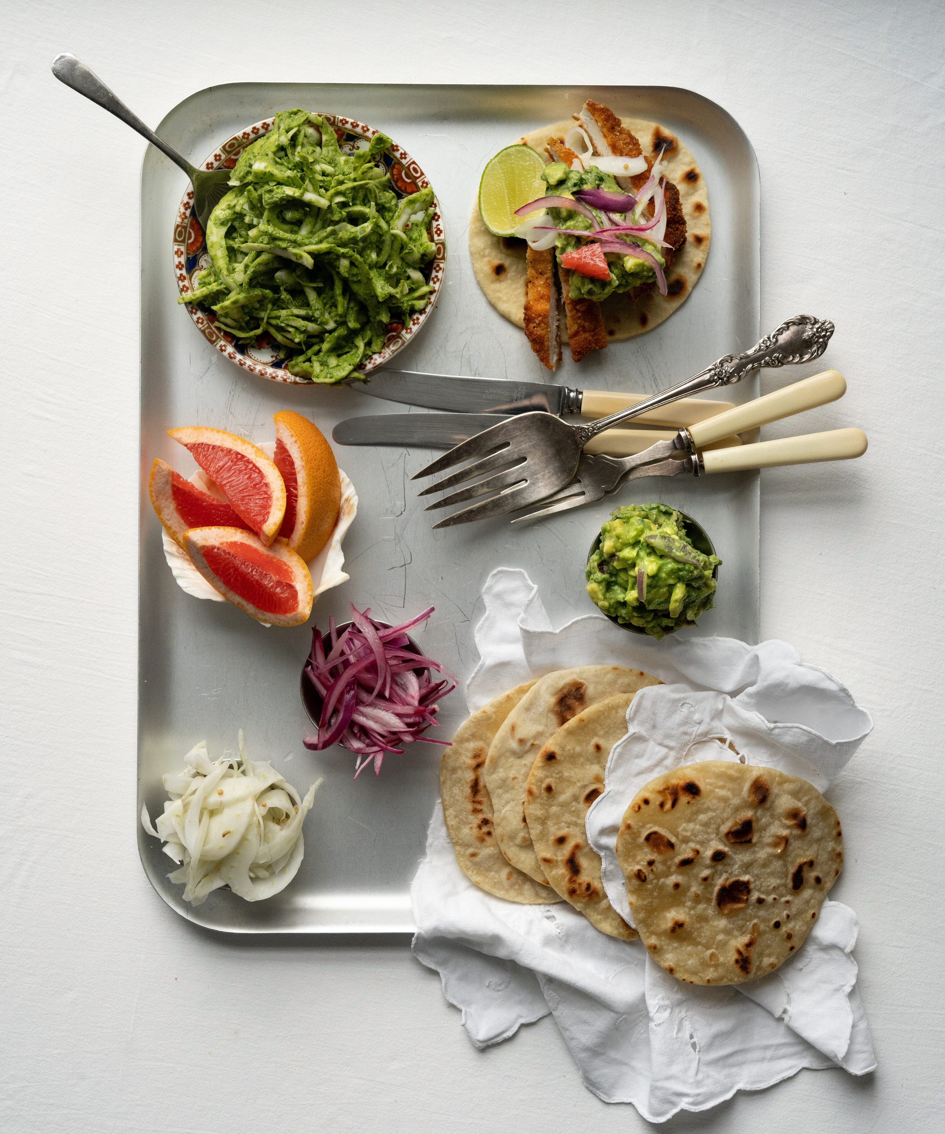 Golden, audibly crisp chicken served straight up with a thick tangle of Green Goddess cabbage — cool, herby and unapologetically creamy. Or, slice and slide into warm tortillas with avocado and grapefruit salsa for something brighter and louder. Same chicken, entirely different energy.