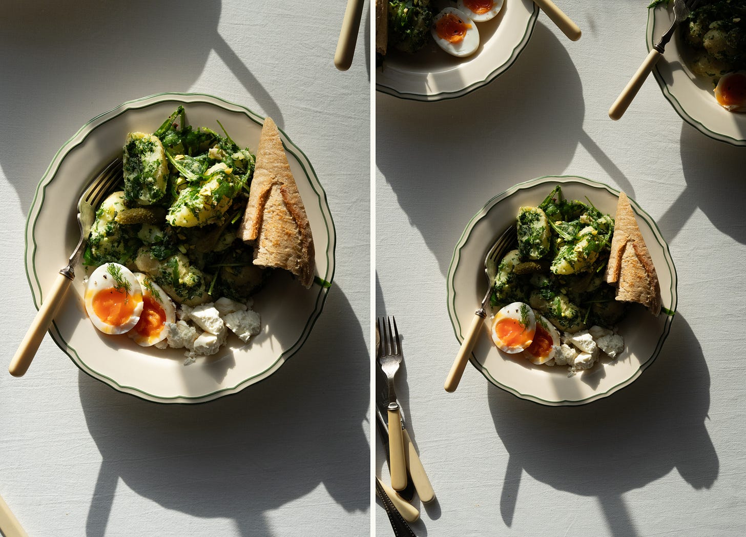 Jammy eggs make the dish: Soft centers spill onto the potatoes, enriching the herbs and creating a silky contrast to the tender flesh. Each forkful should catch a little yolk.
