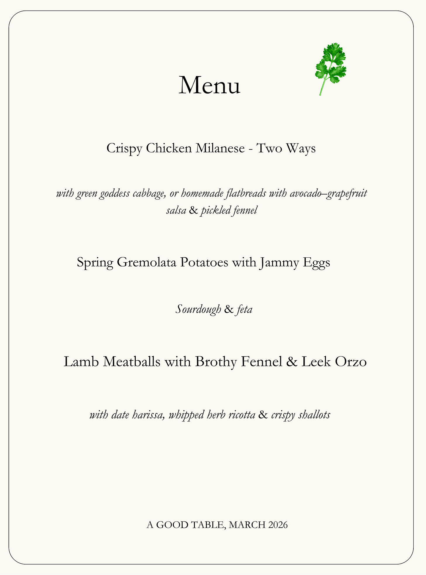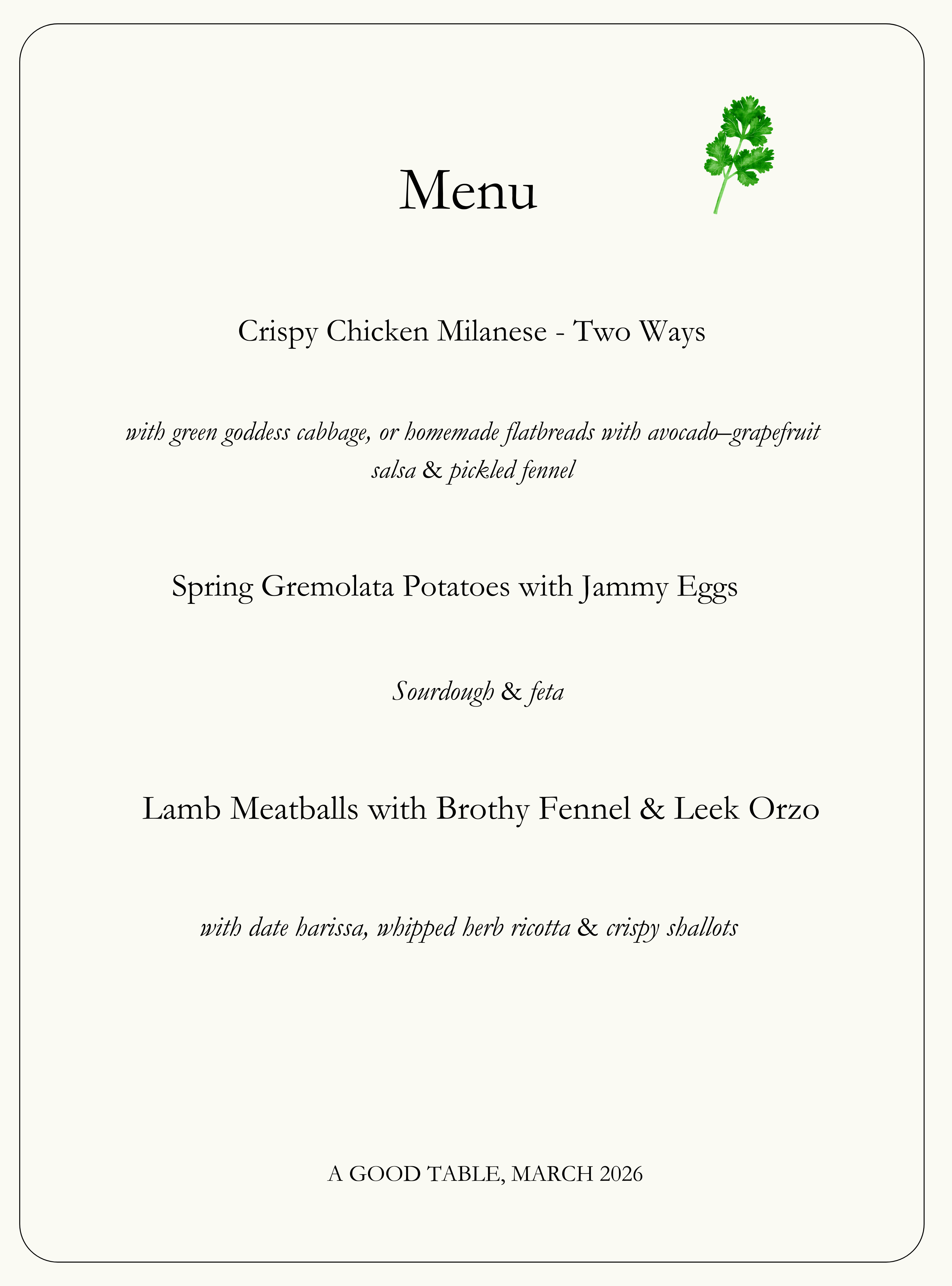 This week’s menu theme: Spring eats.