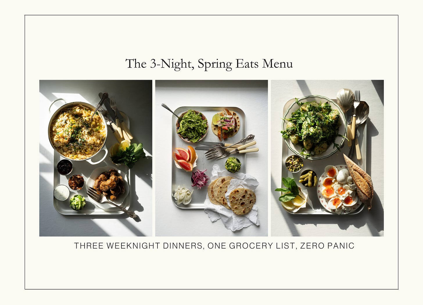 If you’re a paid subscriber, thank you and settle in. Your Monday, Tuesday and Wednesday dinners this week are already mapped out. If you’re not a subscriber, perhaps this is the moment to join. Paid subscribers receive the full three-day plan, a considered grocery list, prep videos, thoughtful alternatives, and access to the entire archive of recipes and newsletters.