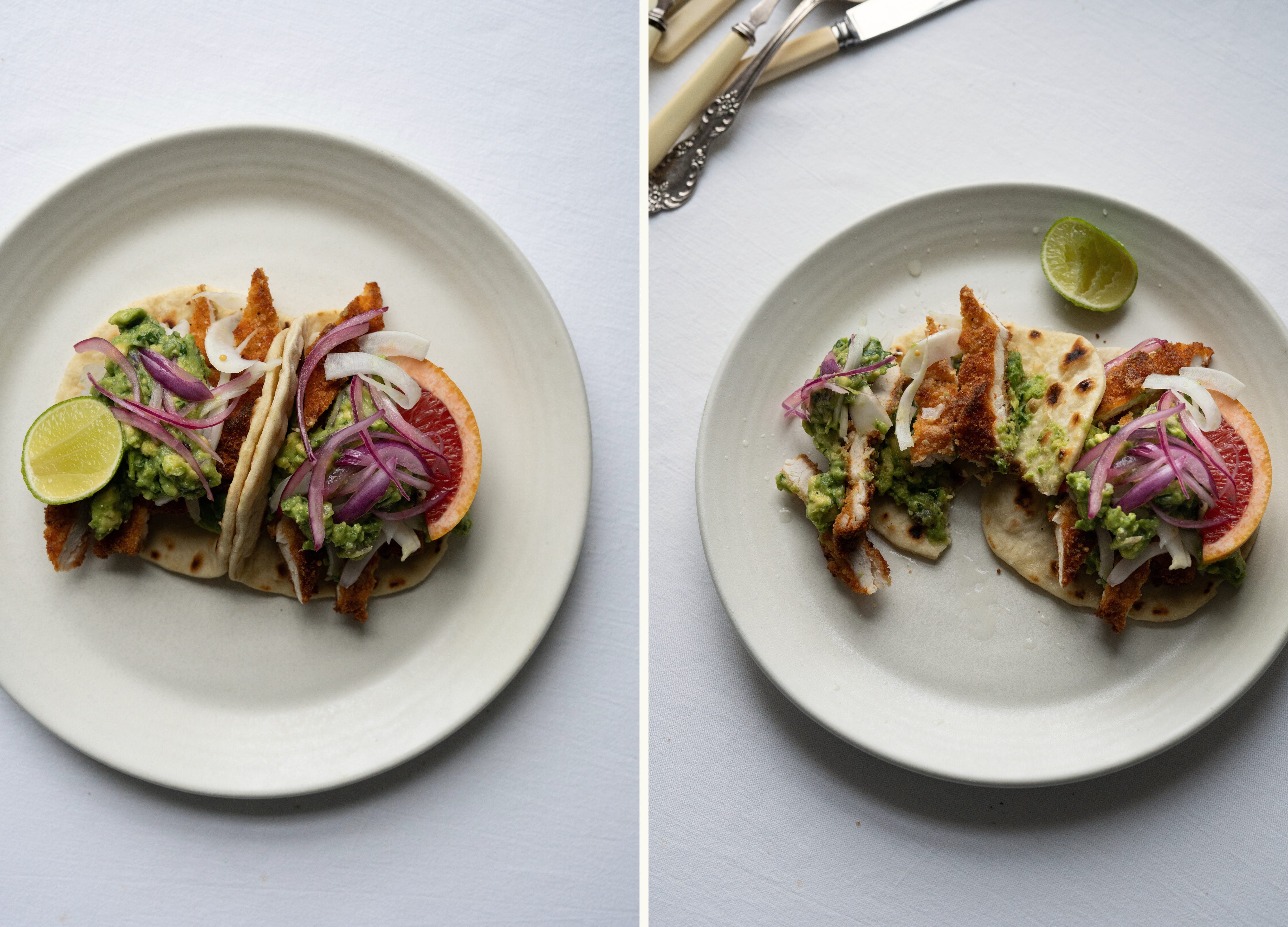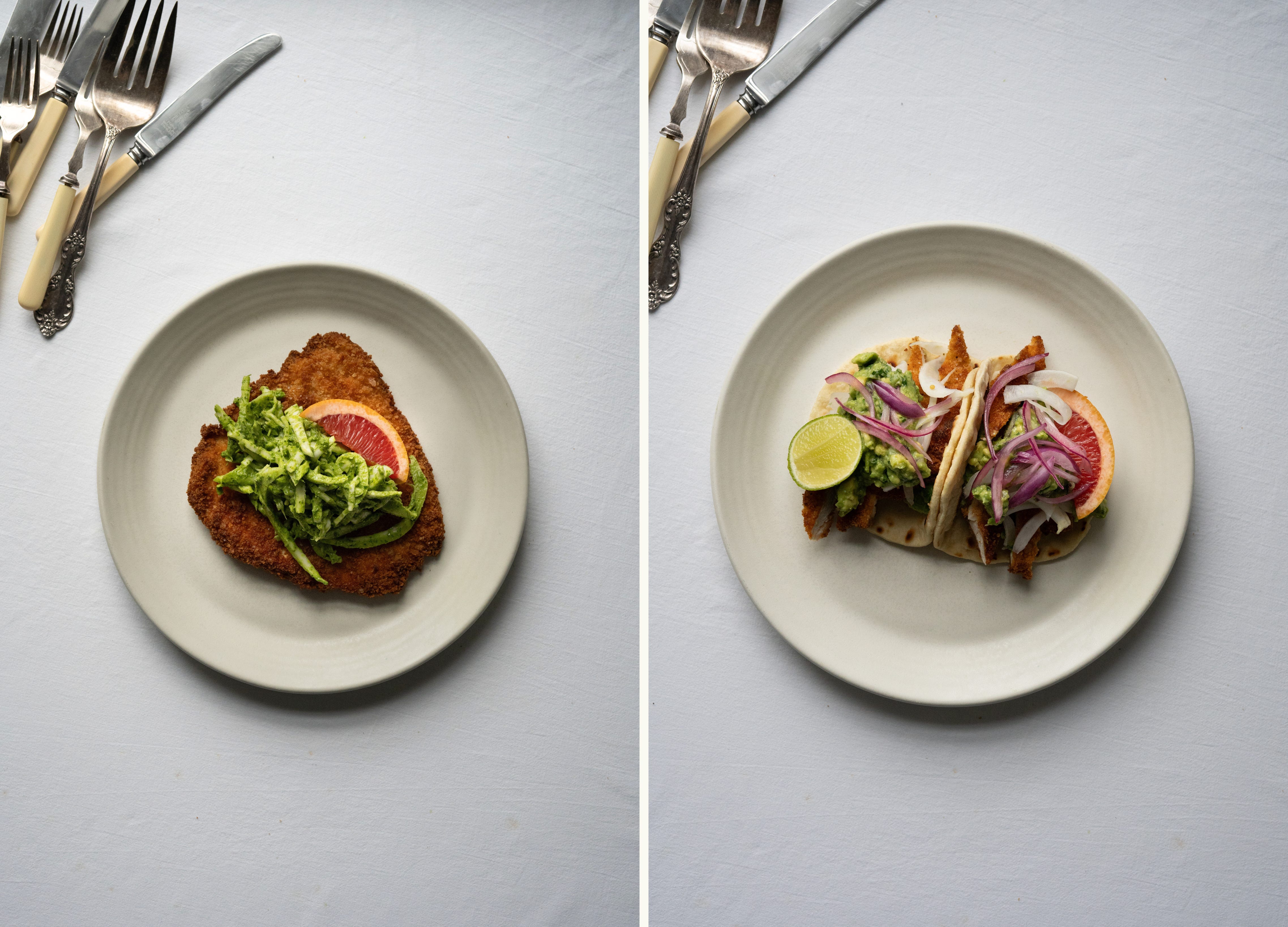 Two ways to serve: Tuck the crisp chicken, herby cabbage and bright avocado–grapefruit salsa into warm tortillas for a generous, hand-held feast. Or arrange the Milanese on a platter and spoon the Green Goddess cabbage lavishly over the top, letting the dressing trickle into the crust.