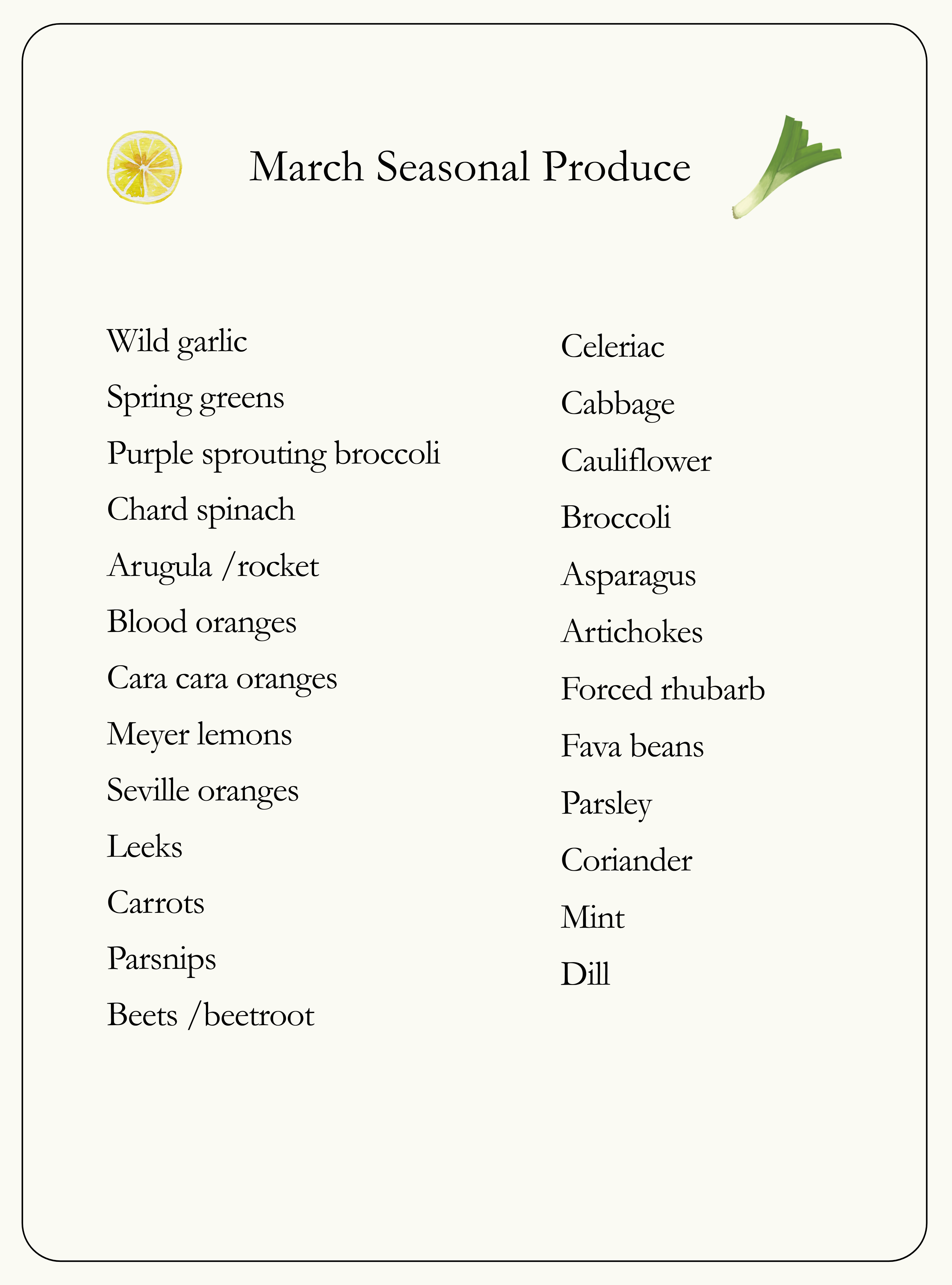 Depending on where you are, March sits on the cusp — a gloriously in-between month. I’m never quite sure whether to reach for a coat or my sunglasses. Citrus is at its brightest, brassicas are still dependable, and the first herbs are beginning to wake up. Thank goodness!