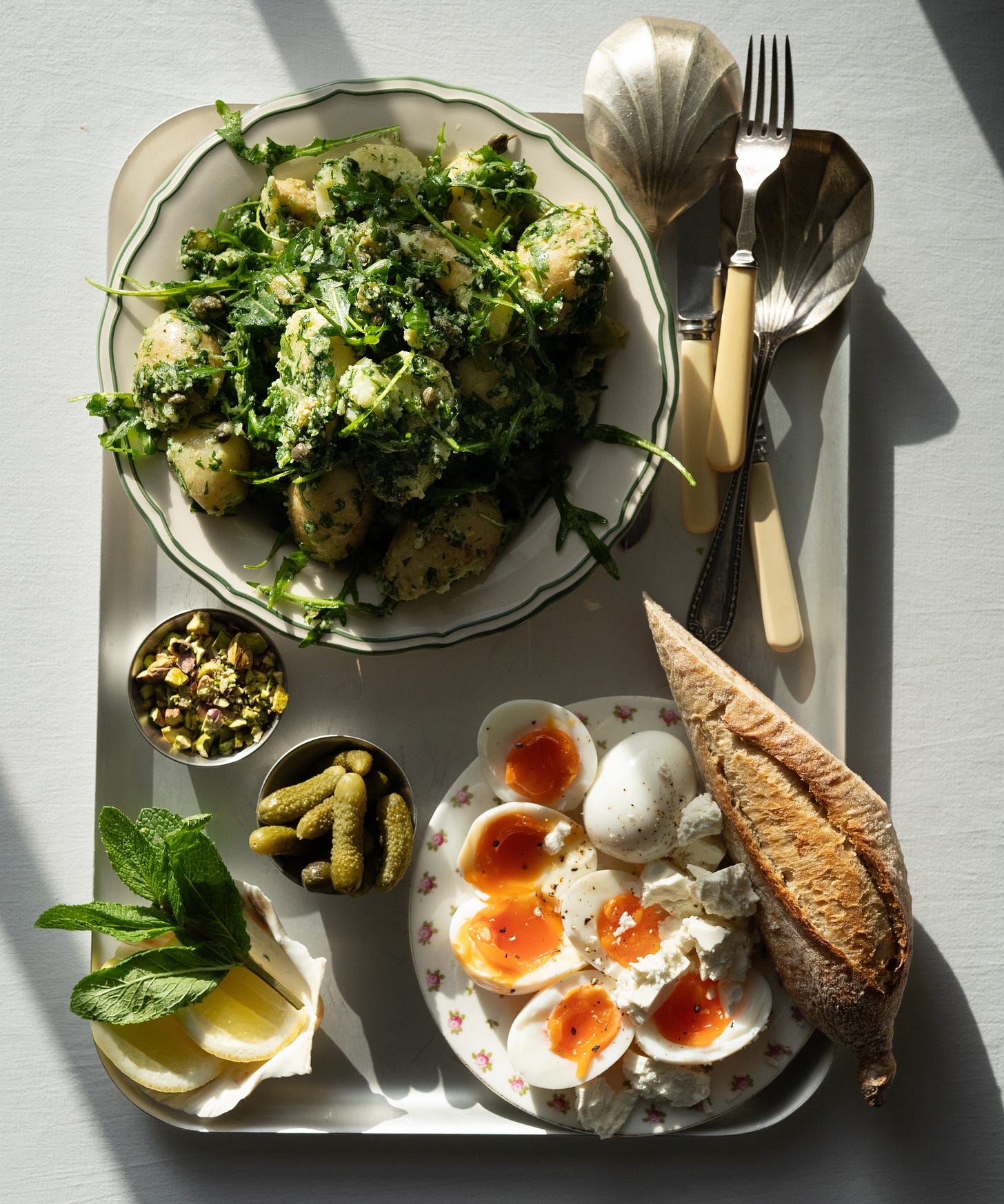 In this quick supper, soft potatoes are tossed while still warm in a vivid, herb-slick dressing that clings to every edge. They are then folded through with peppery arugula, crowned with jammy eggs and finished with lemon. The yolks spill, the herbs sting gently, and thick sourdough is non-negotiable.